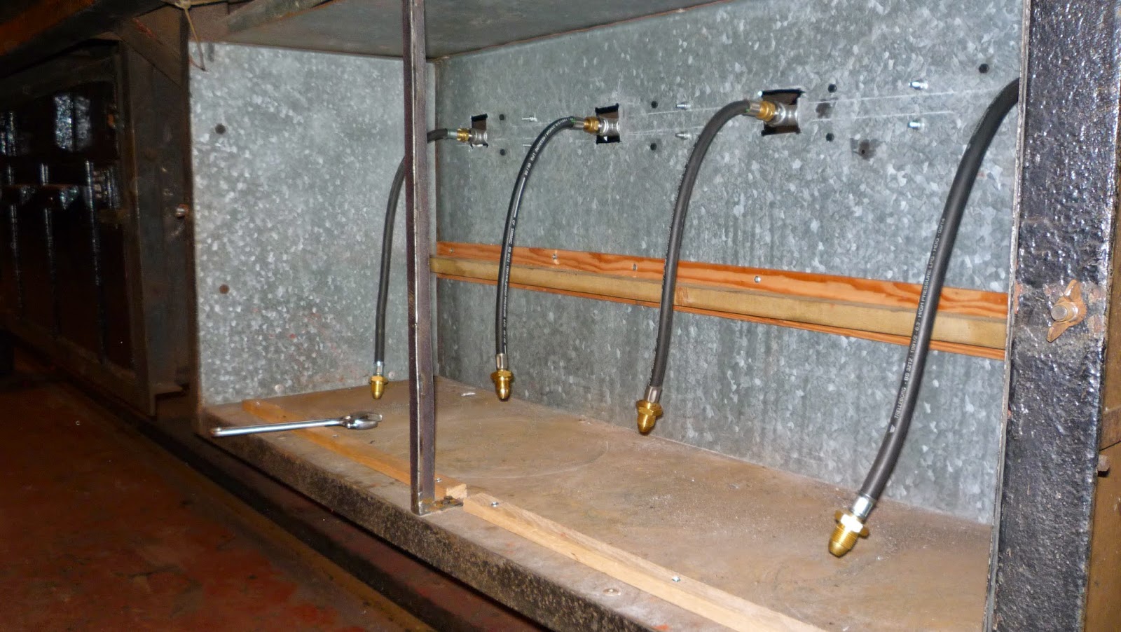 On the kitchen car, 4331, the gas system is being altered. On arrival the system on board was two banks of four propane bottles, each with their own change over valves, To view these valves you had to bend down and look underneath, if red was indicated, bottles 1 and 3 or bottles 2 and 4 had to be changed. Very confusing and probably beyond our Guards. Therefore we are changing the system to that which is used on the RU, keep it the same = less confusion.